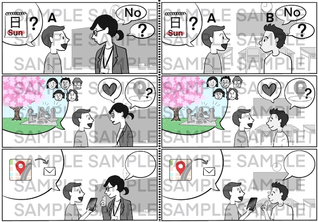 《本イラストセットの特徴》 ・丁寧体と普通体の違いがわかるようになります。 ・親しい関係の人と簡単な普通体の会話ができるようになります。 ・1枚のイラストで複数の会話練習ができます。 ・代入練習をしたり、長い会話へ発展させたりと、応用が効きます。 ・第20課までの既習語彙のみ使用しています。 《各イラストの例文》 01-丁寧体vs普通体 〈左〉 学生A:先生、日曜日、用事がありますか。 先生 :いいえ、ありませんが…… 学生A:クラスのみんなでお花見をします。先生も来ませんか? 先生 :はい、ぜひ行きたいです!どこでするんですか? 学生A:あとで地図を送ります。 先生 :わかりました。じゃ、また日曜日。 〈右〉 学生A:Bくん、日曜日、用事ある? 学生B:ううん。なんで? 学生A:クラスのみんなでお花見するよ。Bくんも来ない? 学生B:うん、行く!どこでするの? 学生A:あとで地図を送るよ。 学生B:わかった。じゃ、また日曜日。 02-普通体会話(過去形) 1) A:週末、何した? B:友達とスキーに行った。 A:いいね。どうだった? B:寒かったけど、楽しかった。 2) A:週末、何した? B:友達とカラオケに行った。 A:いいね。どうだった? B:下手だったけど、楽しかった。 3) A:週末、何した? B:友達とおまつりに行った。 A:いいね。どうだった? B:人が多かったけど、楽しかった。 03-普通体会話(友達を誘う) 1) A:海、好き? B:うん、好き。 A:じゃ、今度、一緒に行かない? B:いいよ。どこの海に行く? A:沖縄はどう? B:いいね。 2) A:山、好き? B:うん、好き。 A:じゃ、今度、一緒に行かない? B:いいよ。どこの山に行く? A:箱根はどう? B:いいね。 3) A:映画、好き? B:うん、好き。 A:じゃ、今度、一緒に行かない? B:いいよ。どこの映画館に行く? A:神戸はどう? B:いいね。 04-普通体会話(友達にお願いする) 1) A:すずきくんの住所、知ってる? B:うん。 A:じゃ、ちょっと送って。 B:いいよ。 2) A:「すずき」の漢字、知ってる? B:うん。 A:じゃ、ちょっとこの紙にかいて。 B:いいよ。 3) A:安くておいしいレストラン、知ってる? B:うん。 A:じゃ、ちょっと教えて。 B:いいよ。
