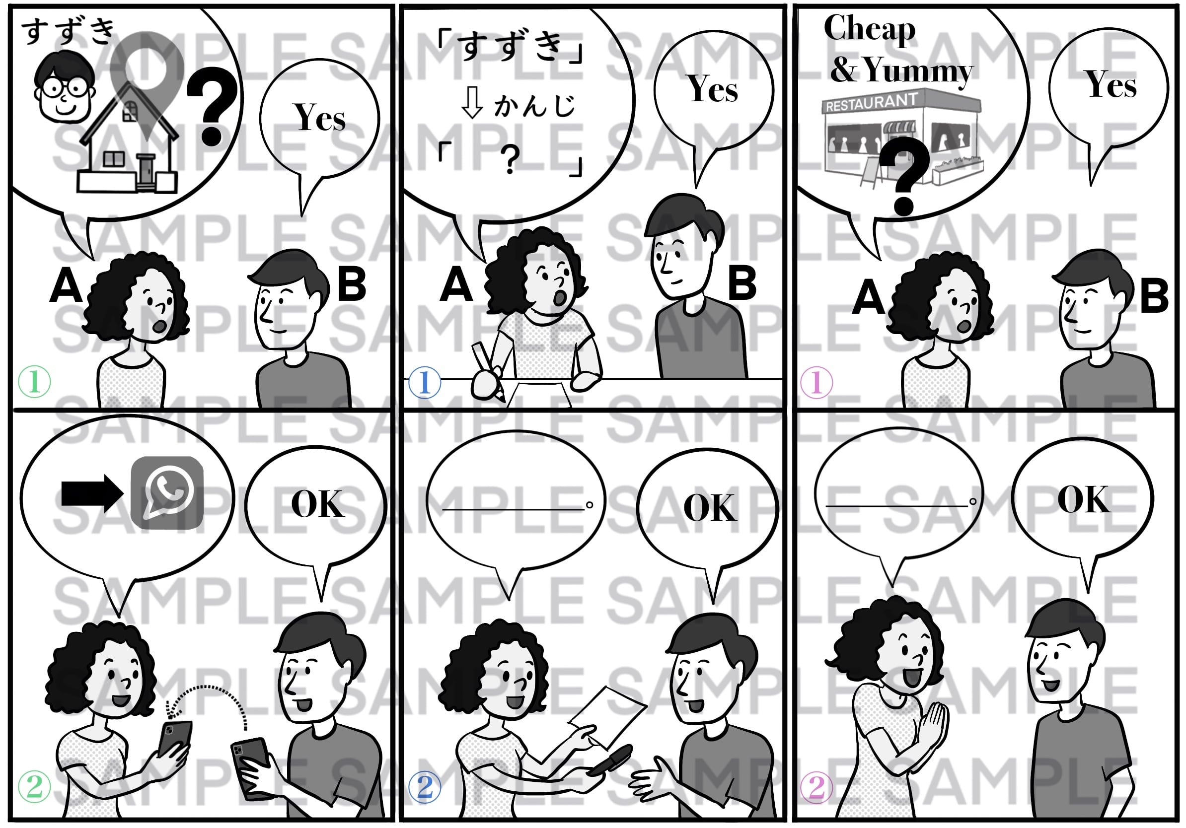 ・1枚のイラストで複数の会話練習ができます。